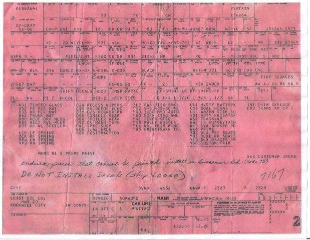 Larry knew that he’d have to devise a good story, so he came up with the idea that a loyal customer wanted a Trans Am in a non-production color. He then called Pontiac and asked to talk to the person in charge of Car Distribution. The receptionist got him in contact with Jim Wilson, who was the Division’s Director of Car Distribution. His executive clout was certainly enough to get any car assembled in any way-and Larry knew it.