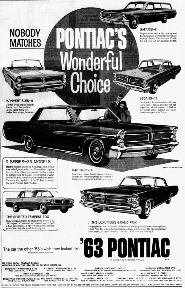 This advertisement in the December 14, 1962 edition of The Gazette provides a look at the wide array of ’63 Pontiacs that Canadian buyers could choose from. Notice the Tempest and Grand Prix?