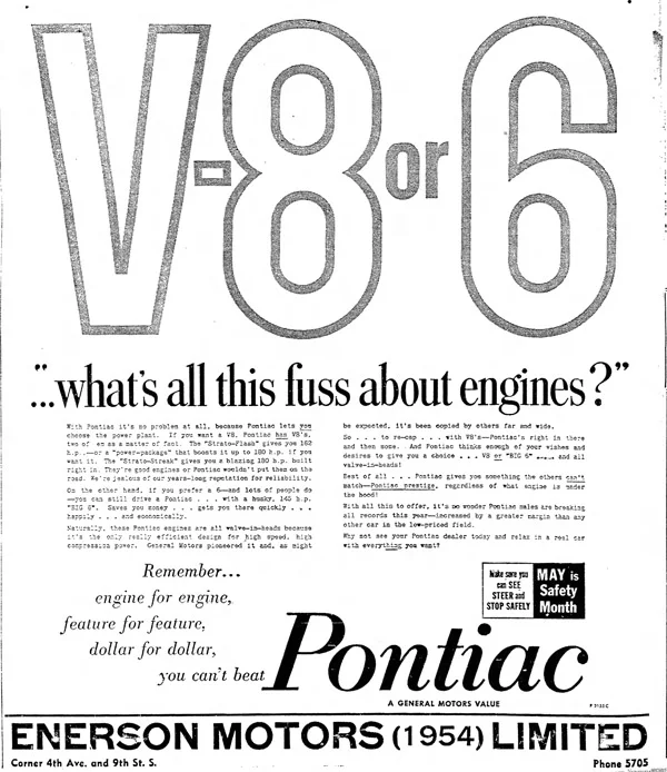 Pontiacs and Chevrolets produced by GM of Canada shared many components. Equipping the Pontiac with a Chevrolet frame required Chevrolet's V8 under hood, but it also allowed GM of Canada to offer a Pontiac with a 6-cylinder, as advertised in the May 10, 1955 edition of The Lethbridge Herald.