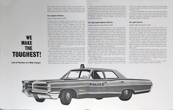 During the ‘60s, it wasn’t uncommon to find Pontiac limos and hearses roaming about. And who can forget the image of JKF’s casket being loaded into a ’63 Bonneville ambulance? I also found a 1966 brochure that outlined the carefully-assembled packages that Pontiac developed for police duty.