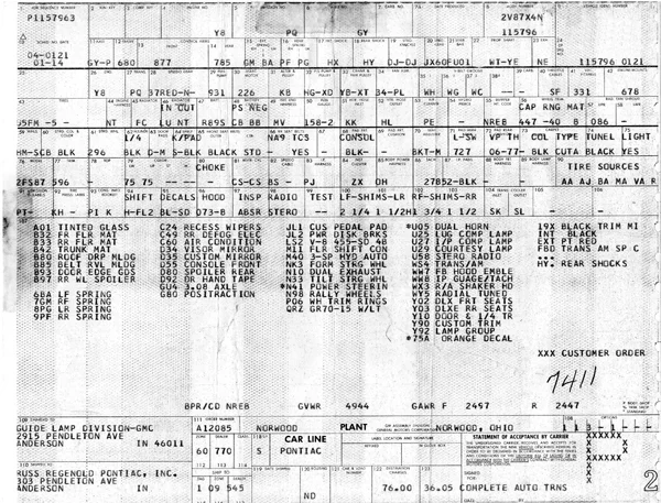 Steve’s Super Duty Trans Am was built in mid-January 1974. It was delivered to GM’s Guide Lamp Division in Anderson, Indiana through Russ Regenold Pontiac, also in Anderson.