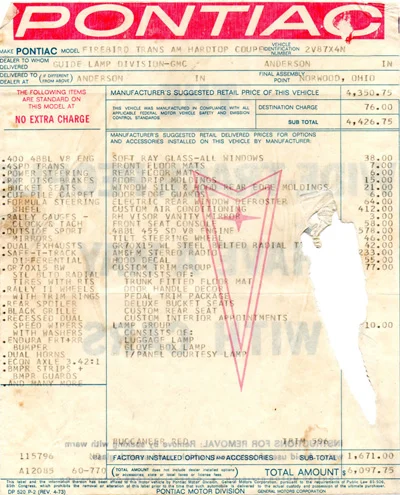 The Super Duty Trans Am was equipped with a host of convenience options. It stickered for nearly $6,100! With his employee discount and by making it a PEP discount, Larry’s selling price was nearly 25% less.