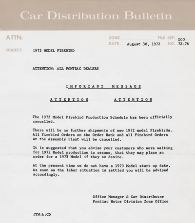 Pontiac issued Car Distribution Bulletin 72-76 on August 30, 1972 officially canceling what remained of the 1972 Firebird production schedule.