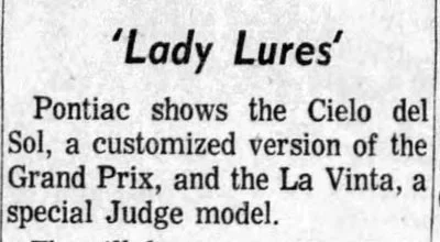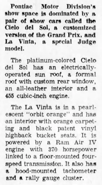 Febrary 15, 1970 printing of the Wisconsin State Journal outlined many the vehicles its readers could expect to see at the upcoming Chicago Auto Show. This is the first and only occurrence I’m aware of that states Pontiac’s Cielo del Sol and La Vinta were aimed at attracting women.